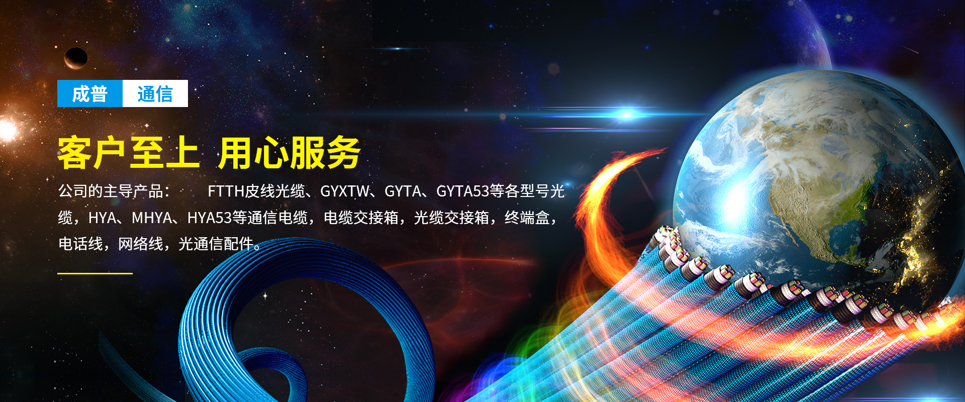 公司的主導產品: FTTH皮線光纜、GYXTW、GYTA、GYTA53等各型號光纜,HYA、MHYA、HYA53等通信電纜,電纜交接箱,光纜交接箱,終端盒,電話線,網絡線,光通信配件。